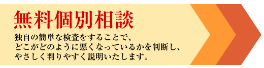 - A当院では治療前に無料であなたの病気について個別で相談に乗っています。あなたの現在の状態を実際に診させていただき、簡単な検査をすることにより、どこ がどのように悪くなっているかを判断し、あなたと同伴されたご家族の方にも悪いところを見ていただき、やさしく判りやすく説明させていただきます。